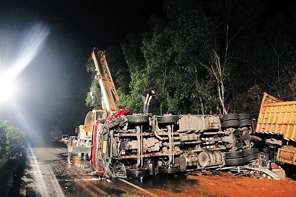 517公里+300米事故现场共有7车发生追尾,其中4辆小轿车、3辆大货车。2辆大货车和1辆小轿车严重变形并引起火灾,火势已经被控制住,随后那大中队增援力量也赶到现场并投入战斗,23时45分,火势被扑灭。大货车驾驶室有1名被困人员(已无生命迹象),1辆小轿车被大货车压在底部,车内有4名被困人员(已无生命迹象),随后支队救援官兵将被困大货车驾驶室的被困者遗体抬出。经过近四个小时的起吊和破拆,04时15分,四名被困人员遗体被抬出。