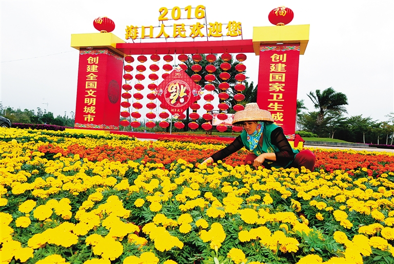 图为12月29日,在海口市火车站广场前,海口环卫工作人员正在摆放鲜花,布置喜庆的场景以迎接元旦节日的到来。