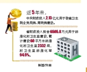 近5年来,中央财政共投入2.13亿元用于我省卫生院业务用房、周转房建设,省财政投入资金6505.8万元用于标准化村卫生室建设,累计建设60平方米标准化村卫生室2332间,村卫生室标准化率94.5%。