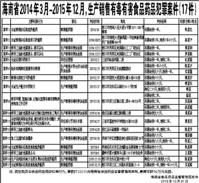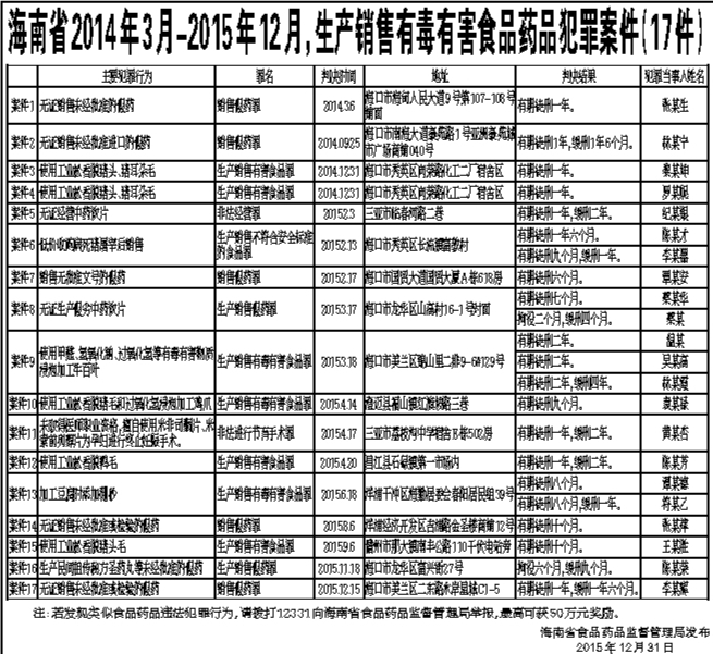 海南省2014年3月-2015年12月,生产销售有毒有害食品药品犯罪案件(17件)