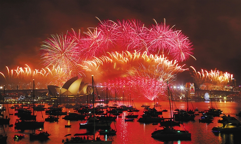 当地时间2016年1月1日,璀璨的焰火在澳大利亚悉尼歌剧院和海港大桥上空绽放,迎接新的一年到来。 新华社/路透