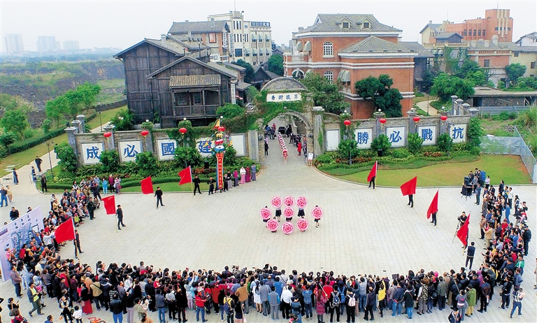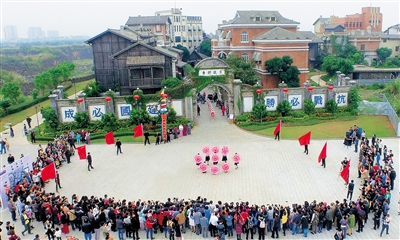 1月1日,众多游客在海口观澜湖华谊冯小刚电影公社南洋街、“1942民国风情街”观光游览,体验“民国穿越”之旅。图为游客在电影公社观看表演。本报记者 张茂 摄
