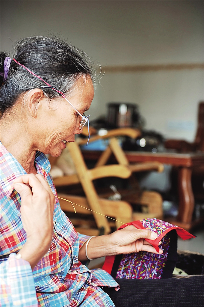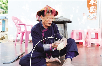 除了“三色饭”,白水岭苗村的乡亲们至今还保持着制作衣服的习惯。据了解,村民们一直自己采集原生树叶泡制染色布料,自裁缝纫服饰。“节假日或庆祝活动,村民都会穿上传统服饰。”盘秀莲说,她头上戴的苗族头巾就是自己织绣的。