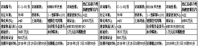 二、中华人民共和国境内外的法人和其他组织均可申请参加,申请人应当单独申请。属境外机构(含港、澳、台地区)申请参与竞买的,按照规定需提交商务主管部门核发的《外商投资企业批准证书》和工商主管部门核发的《营业执照》。三、本次国有建设用地使用权挂牌出让按照价高者得原则确定竞得人。四、本次挂牌出让的详细资料和具体要求,见挂牌出让文件。申请人可于2016年1月4日至2016年1月29日到昌江黎族自治县土地储备整理交易中心或海南省政务服务中心二楼省公共资源交易服务中心22号窗口获取挂牌出让文件。五、申请人可于2016年1月4日至2016年1月29日到昌江黎族自治县土地储备整理交易中心或海南省政务服务中心二楼省公共资源交易服务中心22号窗口提交书面申请。交纳竞买保证金及建设保证金的截止时间为2016年1月29日17时00分。经审核,申请人按规定交纳竞买保证金及项目建设保证金,具备申请条件的,我局将在2016年1月29日17时30分前确认其竞买资格。六、本次国有土地使用权挂牌活动在海南省政府会展楼二楼省公共资源交易服务中心土地交易厅进行, 各地块挂牌时间分别为:C-1-01号地块:2016年1月25日08时00分至 2016年2月3日15时00分;C-1-02号地块: 2016年1月25日08时00分至 2016年2月3日15时00分;七、其他需要公告的事项:(一)挂牌时间截止时,有竞买人表示愿意继续竞价,转入现场竞价,通过现场竞价确定竞得人。(二)本次挂牌出让不接受电话、信函、电子邮件及口头竞买申请。(三)本次挂牌不接受邮寄竞买文件。(四)此次挂牌出让的宗地由竞得人按照县住建部门批准的规划要求进行开发建设。(五)本次出让宗地按现状条件出让,竞买人应当现场踏勘出让地块,申请参加竞买,视为对出让地块现状条件无异议。(六)开发建设期限:建设项目应按出让合同中约定的土地交付之日起一年内开工建设,自开工之日起两年内竣工。(七)本次挂牌出让成交价款不包括各种税费,办理土地登记所产生的所有税费由竞得人承担。土地出让成交后,竞得人必须在10个工作日内签订出让合同,并于合同签订后按合同约定缴清土地出让价款。(八)按正常工作时间(上午8:00-12:00,下午14:30-17:30)受理申请报名手续,节假日除外。(九)本次挂牌出让事项如有变更,届时以变更公告为准。(十)上述所有时间均为北京时间。八、查询网址:http://www.ggzy.hi.gov.cn 九、咨询方式:咨询电话:0898-26630913、65303602、66532003 联 系 人:李文高、王欢