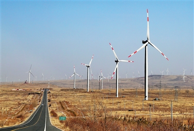 这是张家口坝上地区的一处风电场(2015年3月15日摄)。 1月4日,记者从河北省政府获悉,河北省2015年风电装机容量达到917万千瓦,发电量达168亿千瓦时。其中冀北电网风电装机容量达838万千瓦,发电量153亿千瓦时,同比增长13.7%;河北南网风电装机容量79万千瓦,发电量15亿千瓦时,同比增长4.5%。河北风电迅速发展为京津冀地区节能减排做出了重要贡献。