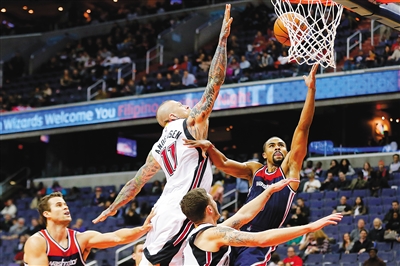图为奇才队球员雷蒙·塞申斯(上右)突破热火队球员克里斯·安德森(上左)的防守上篮。