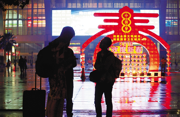 1月4日晚,海口火车东站内,巨大的红色“春”字造型渲染出新春氛围,让过往的旅客提前感受到年味的喜庆。