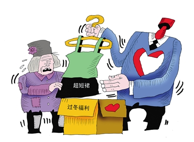 过冬送福利,本该是棉衣棉被暖人心,然而,让人始料不及的是,七旬残疾老翁领到的福利,竟然是短裙短裤,真让人哭笑不得。送温暖倒成了割心寒。众所周知,关爱弱势群体就要认真对接他们的需求,诸如“短裙福利”的爱心错位,反映的正是工作人员应付虚浮的工作作风,送爱心却不走心,送温暖成了走过场。当下,扶贫尚且呼唤“精准”,慈善更不能随意,关爱弱势群体就要知其冷暖,送其急需,切切实实地解决其困难,如此才能使爱心“无缝对接”,才能真正实现雪中送炭。这正是: