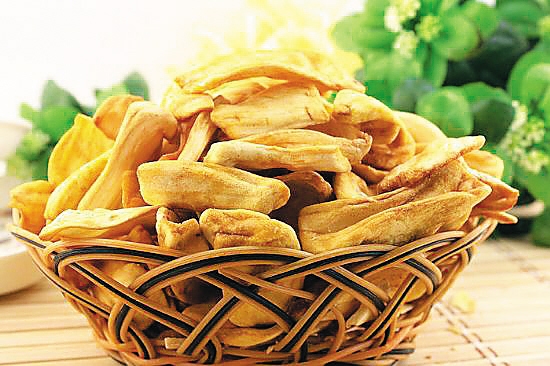 菠萝蜜被称为水果之王,其凹凸不平的果皮内藏着无数金黄色肉包,肥厚柔软,清甜可口,香味浓郁,其果肉含有糖分、脂肪、蛋白质等。菠萝蜜干通常选用新鲜菠萝蜜果肉制成,其口味酥脆爽口,香而不浊,含有蛋白质、多种维生素和矿物质等,并可避免多余脂肪酸,是海南当地最时尚的休闲食品之一。