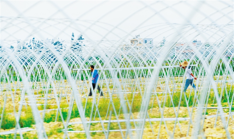 目前该生产基地辟出2000亩菜地专门生产叶菜,其中1200亩为大棚生产,防雨防风防虫,确保产量稳定。海口全市各瓜菜生产基地同步加大生产力度,为即将到来的春节保障丰富的蔬菜供应。本报记者 苏建强 摄