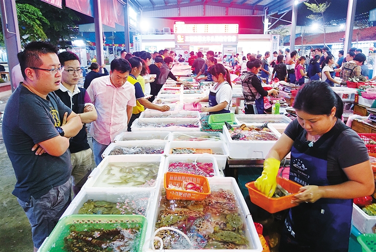 1月3日,三亚火车头万人海鲜广场,游客正在挑选各式鲜活的海鲜,公道的价格,热情的服务让不少游客慕名而来。近年来,三亚对旅游市场欺客、宰客现象的严格治理,让旅游环境得到较大改善。 本报记者 王凯 摄