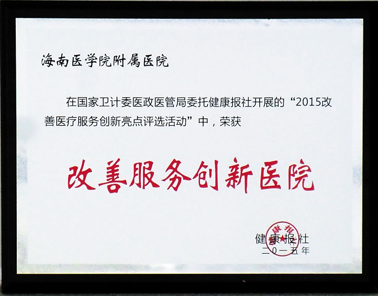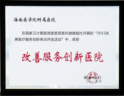 一枝一叶总关情,贴心的服务举措、良好的优质服务、精益求精的医疗技术和高尚的医德,使海医附院获得了社会各界的普遍赞誉,也成就了自身服务品牌,让患者情真意切地感到附院“好在服务,贵在真情”。2015年,该院开展志愿者服务1242人次4968小时。近几年来,病人对海医附院服务满意率保持在95%以上,收到患者写给医务人员的感谢信、表扬信、锦旗和拒收红包不计其数。病人以就医过程中的切实感受表达那种朴素的情感,字里行间没有什么华丽的辞藻,都是一种真情实感的流露。有一封感谢外科崔海宁教授的信中说,感谢您治好了我孙子的病,这是您为我家第6个成员动手术了。老人的感谢信里,透露出一家三代对海医附院的深深感激之情。2015年1月14日,乳腺肿瘤外科高炳玉副教授荣获海南省“首届寻找百姓身边好医生”十佳;4月16日,国家卫计委授予海南医学院附属医院“全国妇幼健康工作先进集体”荣誉称号,金松教授评为全国“先进个人”;9月,海南医学院附属医院荣获“省卫生人才智力扶持中西部市县第九期项目实施先进单位”称号,李军副教授荣获“先进个人”荣誉称号。