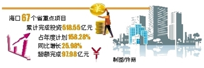 据悉,海口塔去年下半年开工以来,进展顺利,投资项目百日大会战启动后,项目建设单位每天组织近200名工人,三班倒日夜施工,目前正加紧进行基坑支护土方工程施工;日月广场总建筑面积约50万平方米,总投资约52亿元,目前地下室主体结构完成,地上建筑完成约85%;海口观澜湖、海口南海明珠人工岛、海口丁村现代物流园、海南国际汽车园等项目都不断加快推进建设速度,投资超序时进度。仅去年12月份,海口67个省重点项目投资69.94亿元,同比增长31.22%。