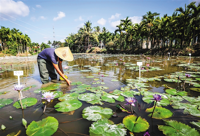 据悉,三亚市南繁科学技术研究院结合三亚气候及旅游资源优势,积极开展农旅融合元素热带睡莲花卉研发。目前,该院已初步建立了睡莲种质资源圃和育苗基地,先后引进热带睡莲品种近60个,其中较为珍贵的品种有奥斯塔、变色澳洲、粉火烈鸟等20多个,目前自主培育成功“南莲1号”新品种,并实现睡莲进稻田栽培模式。