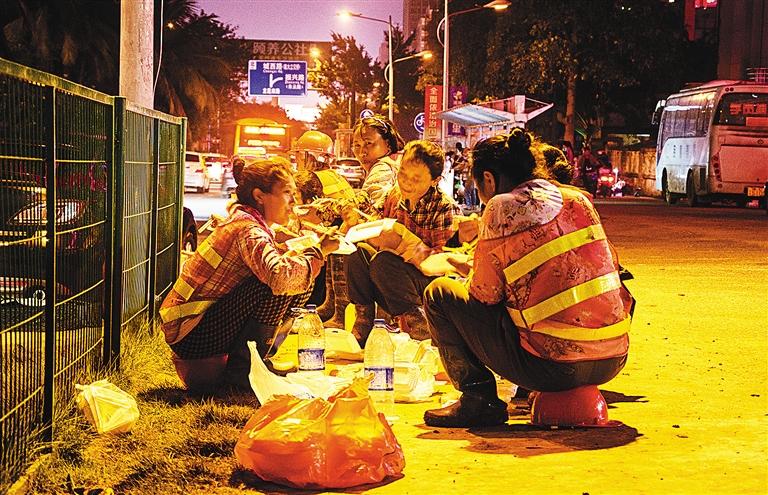 1月6日晚上,在海口市龙昆南路,几名为了赶工的园林女工正在路灯下吃晚餐。在海口的“双创”工作中,为了让我们的城市更加漂亮,很多一线的园林工人付出了辛勤的劳动。