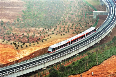 这是上线试运行中的长沙磁浮快线。 目前,已经开始试运行的长沙磁浮快线持续进行系统调试,计划2016年上半年正式载客试运营。 据介绍,湖南长沙中低速磁浮快线是中国首条拥有完全自主知识产权的中低速磁浮铁路。这条磁浮快线连接长沙火车南站和黄花机场,全长18.55公里,全程高架敷设,于2014年5月开工建设。目前,相关方面正对长沙磁浮快线各设备系统和整体系统进行可用性、安全性和可靠性考核,对运营人员培训、故障模拟和应急演练等情况进行检验,从而确保各项指标达到试运营的标准。新华社记者 龙弘涛 摄
