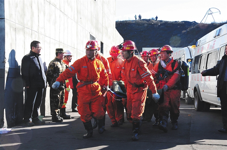 1月7日,救援人员运送一名被困人员的遗体。 陕西省榆林市神木县孙家岔镇刘家峁煤矿1月6日发生一起井下事故,截至7日13时30分,11名被困人员已全部被搜出,无一人有生命体征。目前,陕西省政府已成立事故调查组,事故原因正在调查中。 新华社记者 郑昕 摄