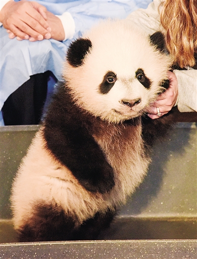 1月7日,在美国首都华盛顿,大熊猫“贝贝”接受体检后与媒体见面。 当日,华盛顿国家动物园4个多月大的大熊猫“贝贝”进行了体检。