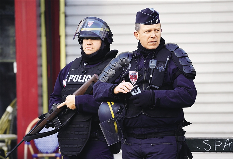 1月7日,在法国巴黎,警察在案发现场附近巡逻。据法国媒体报道,7日上午,一名持刀男子在试图闯入巴黎第18区的一个警察局时被射杀。 新华社/法新
