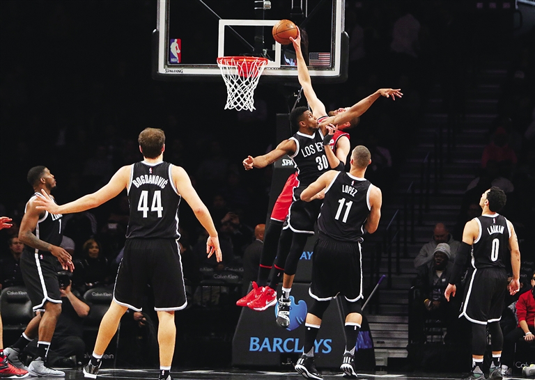 图为网队球员赛迪斯·杨 (上左)在比赛中防守多伦多猛龙队球员尤纳斯·瓦兰丘纳斯(上右)。
