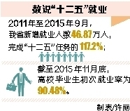 “十三五”期间,我省将进一步优化就业结构。2015年至2020年,每年城镇新增就业9万人,转移农村劳动力8.5万人,失业人员再就业3.4万人;应届高校毕业生初次就业率稳定在82%以上。到2020年,第三产业从业人数比重达到60%。