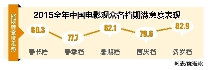 中国电影观众满意度调查由中国电影艺术研究中心联手艺恩共同开展,自2015年春节档起,全年共调查五个档期,合计45部国产影片。由于贺岁档的高满意度,也将2015年度观众满意度拉高至81.2分。