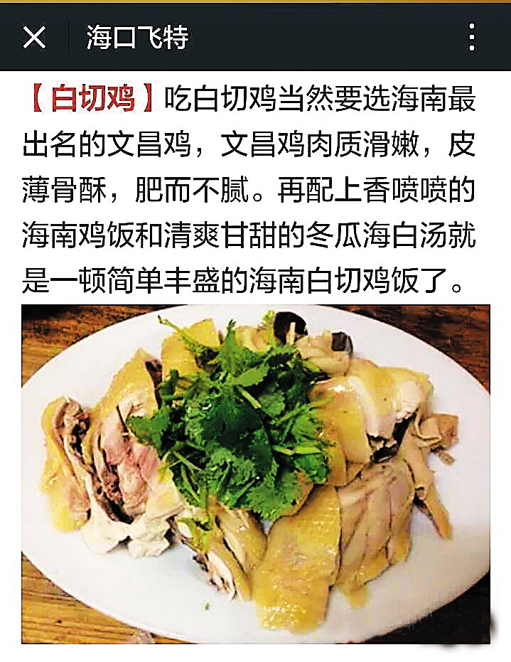 都说最高级别的“吃货”除了爱吃、会吃之外,还得掌握一手好厨艺。微信公众号“海南美食”就为了培养“高级吃货”,以“周末厨房”为栏目,推出一些海南家常美食的做法。最近一期美食教学内容令人大开眼界,竟是教做海南甜蜜传统菜——拔丝鸡蛋,可谓“脑洞大开”。再往下翻,一篇《榴莲鸡汤:海南美食中的极品!不吃不算来过海南!》让在海口生活20年之久的海南日报记者都开始怀疑自己是否来过这座城市,也开始拜服于海南美食品类之多、涉猎之广、包容性之强。