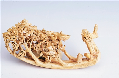 海口市博物馆藏象牙雕李白乘槎摆件为民国雕刻作品,造型呈一舟状,尾部的浓密树杈蜿蜒上举,又回溯至槎身。槎身最前端站一雅士,衣冠博带,迎风而立,一手握卷,一手执壶,似在以诗酒自娱,观此雅士豪放不羁的风度及唐代装束应是“斗酒十千恣欢谑”的诗仙李白。太白旁应还立一人,因牙雕损坏,仅存两腿,从腿部衣饰特征来看可能为一童仆。此作品雕工巧妙,树槎纹理的表现极为逼真,牙质圆润,结构匀称,是牙雕乘槎题材的上乘之作。
