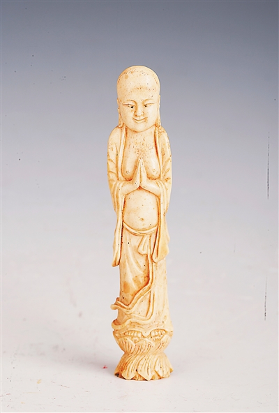 罗汉在小乘佛教看来是修行者所能达到的最高果位,进入这个阶段后便断绝了人世间的一切烦恼,不再进入生死轮回。在佛教寺院中比较常见的塑像是十六罗汉、十八罗汉和五百罗汉等,他们一般是髨首的比丘,穿着僧衣,形态各异,悠然随意,反映出清修梵行并已了悟佛理的高僧德性。最为常见的罗汉为佛陀的旁侍迦叶与阿难尊者,迦叶的模样一般是老成持重,阿难则是年轻敏思。从市博所藏的牙雕罗汉来看,与阿难尊者的形象较为接近。但为表庄重,阿难作为佛陀协侍开襟穿着的形象较为少见,这与市博的牙雕罗汉有所区别。