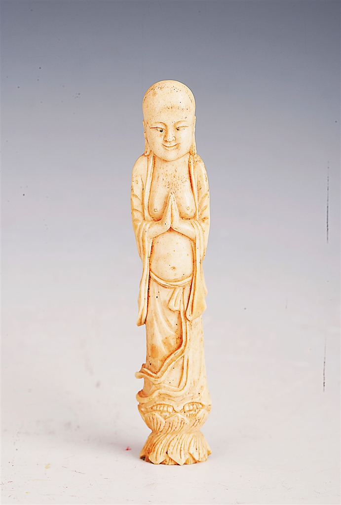 民国象牙雕罗汉像为髨首,头部相对较大,修耳垂肩,双目下视,坦胸露乳,双手合十立于莲花座之上。整体牙质细腻,采用圆雕技法,罗汉体态匀称,雕刻刀法简练,衣纹采用富有装饰性的折叠和阴划线表现,线条流畅,轻薄流动,呈现出质感美。作者重视刻画其微笑的神态和沉静深思的气质,可谓罗汉牙雕的艺术珍品。