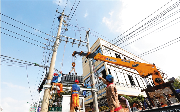 1月6日,在海口市龙泉镇,电网工作人员正在改造电网线路,提高乡镇的供电能力。据介绍,海南电网2015年投资43.3亿元创历史新高,今后,海南电网将继续加大电网建设投入,预计未来3年,海南电网公司的固定资产投资超过120亿元,重点投向电网主干网架及城乡配网改造建设。目前电网相关部门正在加大项目储备,加快项目前期工作,持续加强电网建设改造,提高供电保障能力,促进地方经济发展。