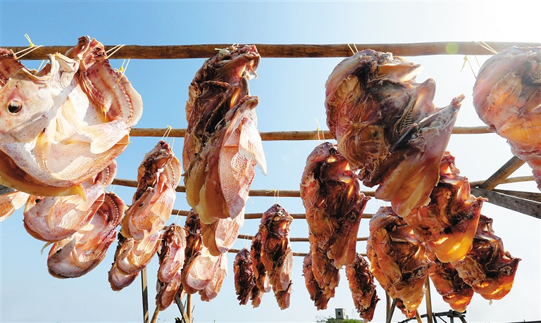 “长坡米烂洛基粽,王五狗肉香透胸,马井红鱼香破釜,排浦薯香吃肚膨。”这是一首在儋州当地流传已久的民歌,歌中提到的马井红鱼,就是儋州的渔业大镇白马井镇出产的红鱼干。