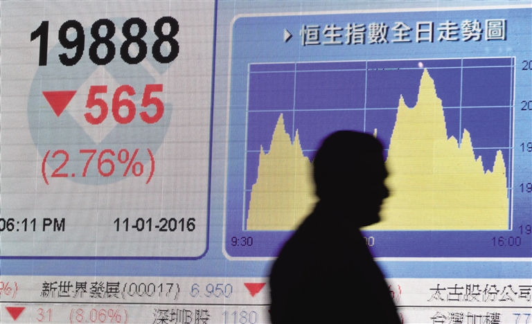 1月11日,一位市民在香港中环一家银行前走过。 当日,港股持续跌势,恒生指数收市失守20000点,收报19888点,跌幅为2.76%。 新华社发(伍永健 摄)