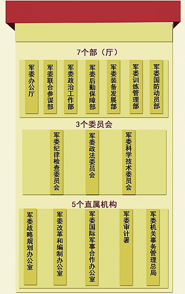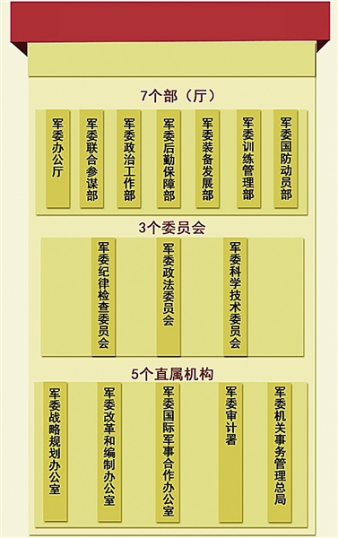 吴谦:调整组建后,军委机关由原来的总参谋部、总政治部、总后勤部、总装备部等4个总部,改为7个部(厅)、3个委员会、5个直属机构共15个职能部门,即:军委办公厅、军委联合参谋部、军委政治工作部、军委后勤保障部、军委装备发展部、军委训练管理部、军委国防动员部、军委纪委、军委政法委、军委科技委、军委战略规划办公室、军委改革和编制办公室、军委国际军事合作办公室、军委审计署、军委机关事务管理总局。