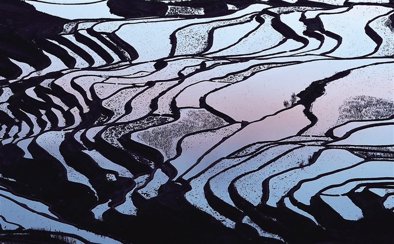 这是云南省红河州元阳县的哈尼梯田美景(1月12日摄)。 哈尼梯田位于云南省哀牢山南部,遍布于红河哈尼族彝族自治州元阳、金平、绿春等县,仅元阳县境内就有19万亩。哈尼梯田是以哈尼族为主的当地群众利用“一山分四季,十里不同天”的地理气候条件创造的农耕文明奇观,已有1000多年的历史,具有令人惊叹的历史、科学、美学和实用价值。2013年6月,中国云南哈尼梯田入选联合国教科文组织世界遗产名录。 新华社发