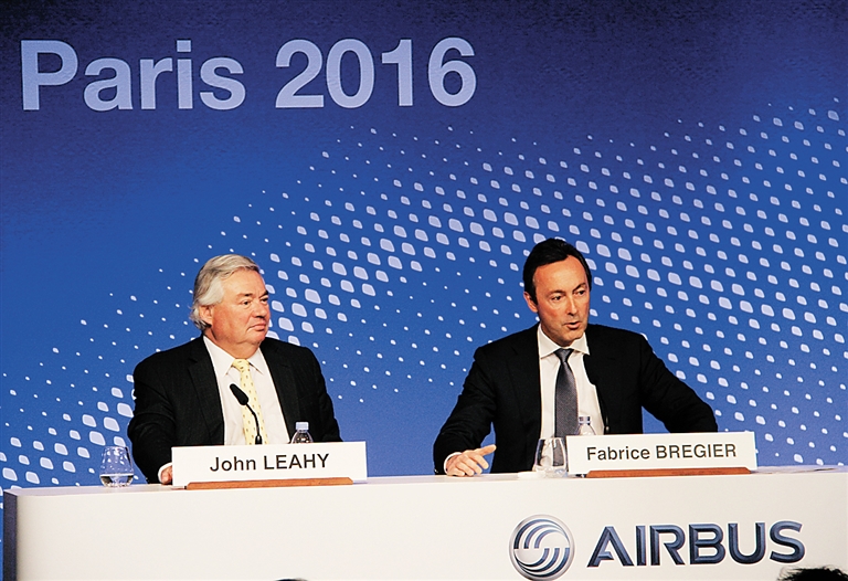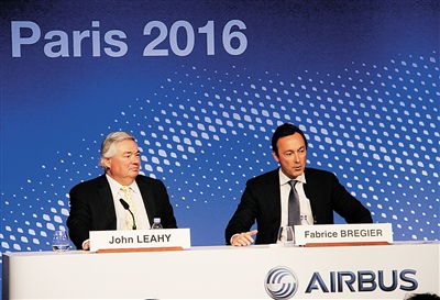 1月12日,在法国巴黎,空中客车公司总裁兼首席执行官法布里斯·布利叶(右)和公司客户事务首席运营官雷义在新闻发布会上介绍情况。 空中客车公司12日宣布,空客去年共向全球85家客户交付635架飞机,创空客历史新纪录,实现飞机交付量连续13年增长。