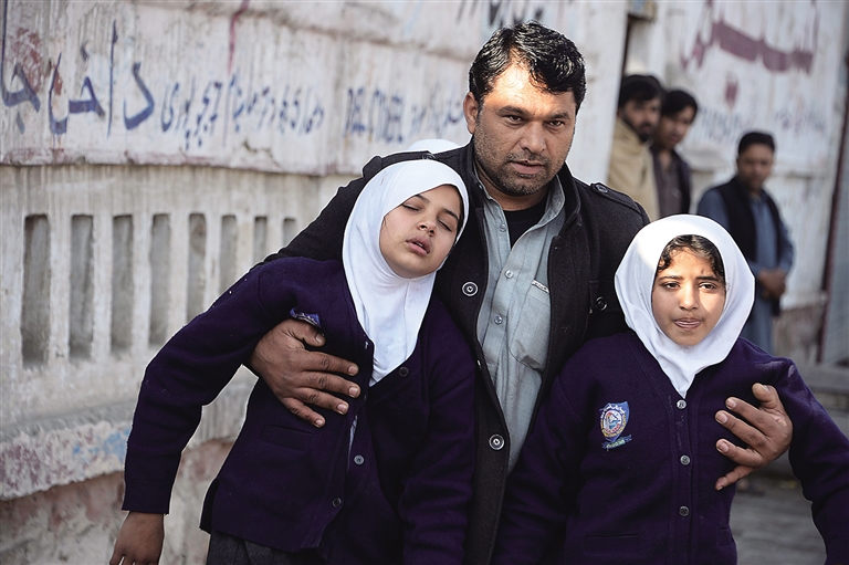 1月13日,在阿富汗东部楠格哈尔省省会贾拉拉巴德,一名男子帮助袭击现场旁的两名女学生。
