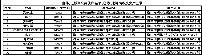 海口市琼山区红城湖片区棚户区(城中村)改造项目正在进行中,现正在进行土地和房屋权属调查。由于位于海口市琼山区环湖路2号红城湖公寓的住户(具体名单、座落、建筑面积及房产证号见附件)仅能提供房产证不能提供土地证,因此凡对该小区土地及建筑物主张权属或者对该小区土地及建筑物权属有异议者,请自登报之日起7天内,向我部提交书面材料(包括不限于土地证、报建报批、抵押他项权利证书、已生效裁定书、判决书、仲裁裁决书等有效凭证),逾期不提交则视为对该土地及建筑物权属无异议,我部将依法进行拆迁、补偿。 联系单位:琼山区棚户区(城中村)改造指挥部