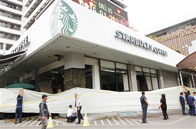 1月14日,在印度尼西亚首都雅加达,工作人员用警戒线围住在袭击中受损的咖啡馆。 印度尼西亚首都雅加达市中心14日发生爆炸和枪战,造成7人死亡,其中包括5名袭击者。警方说,另有2名袭击者被活捉。 当天晚些时候,极端组织“伊斯兰国”认领这次袭击。 新华社/路透