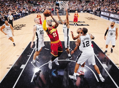 图为骑士队球员詹姆斯(前,左二)在比赛中进攻。新华社发
