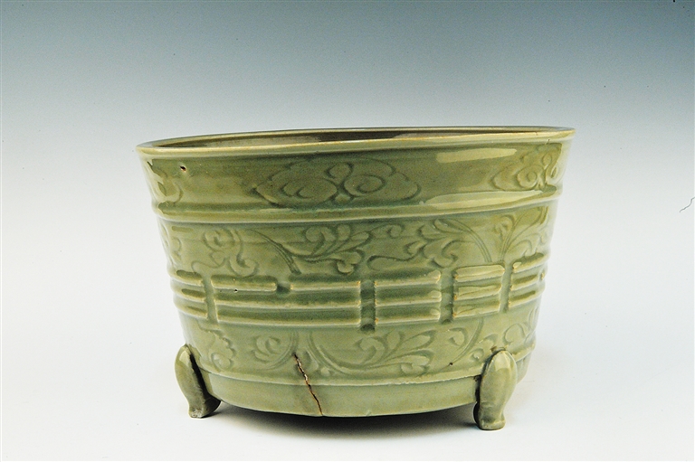 该炉2001年入藏,口径28.7cm,通高18.7cm,器型周正,保存完好,因其鲜见而被国家文物鉴定委员会专家定为国家二级文物。该炉炉口沿筒形腹,敞口,直壁,平底,内外施釉,外腹凸刻八卦纹,外壁刻折枝花卉纹,下承三兽蹄足,底间有孔,垫烧与胎接触处火石红成色鲜艳。内壁素面,釉面粉青匀泽,瓷胎密致厚重,制形雄浑大气,釉面通体无开片。该炉外腹一周刻有凸起的八卦图纹装饰,而号之为“八卦炉”,道教经籍中以八卦衍释经义,象征天、地、雷、风、水、火、山、泽八种自然现象,为古代瓷器装饰的典型宗教纹样之一。该炉造型古朴,釉色纯美,釉面莹润,工艺精湛。这类炉源自道教炼丹所用铜炉,多见于民间香炉,又因其底间有孔,与花盆形制相似,亦有插花装饰之功用。龙泉窑的瓷炉久负盛名,该八卦炉既是青瓷特色之作,亦是拜神礼佛之供器,兼有花盆之功用,一炉两用,实为难得。