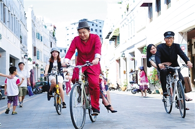 这位“归国华侨”,和他身边其他的“民国”朋友推着莫曼顿复古式自行车,边走边说着话,发出爽朗的笑声。他们时而踏上车,时而推着车,遇到经过身边的“民国大家”,打打招呼问问天气。乏了累了,就走进骑楼老街古色古香的咖啡店、茶馆,喝着咖啡,品着香茗,惬意而舒适。在这里时光仿佛倒转了百年,他们也似乎变身成了装扮的民国人物,神态举止一股典雅的气息。