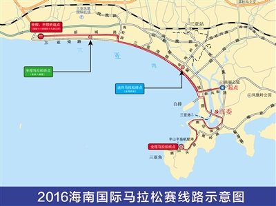 2016海南国际马拉松起点为三亚市美丽之冠,赛道主要沿着三亚湾、新城路、南边海路等路段进行,全程终点为半山半岛帆船港(半程终点设在海坡路六横巷、5公里迷你马拉松终点设在金鸡岭街)。三亚湾路赛道优美,景致如画,特别是沿三亚湾路修建的椰梦长廊绿树婆娑、白沙细浪、碧海蓝天。从整条赛道看,东起三亚港,西至天涯湾。“人道十里银滩美,却只是未见过绵延二十里的椰林画廊”。漫步滩边,东西玳瑁洲(东岛西岛)相邻而望,美不胜收,是跑友不得不参加的必跑赛道之一。