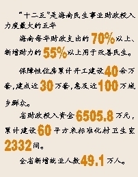 小财政办大民生,“十二五”是海南民生事业财政投入力度最大的五年,海南每年财政支出的70%以上、新增财力的55%以上用于改善民生。
