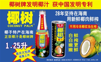 椰树集团正抓住海南全面启动国际旅游岛先行试验区的有利机遇,建设工业旅游园区。以椰子汁和火山岩矿泉水两个“中国国宴饮料”和“中国名牌产品”的效应和现代化生产流程作为工业旅游的示范项目。集团要将老城饮料生产基地建设成为具有火山特色、椰树风光的海南国际旅游岛工业旅游园区。更大的规模,更大的梦想,等待椰树集团的又是一番新挑战。而这也将成为一个老牌企业续创佳绩、绽放新颜的新机遇。(本报海口1月18日讯)