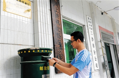 图为一位青年正在给家人邮寄写满了祝福的三沙自然风光名信片。