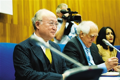1月19日,在奥地利首都维也纳的国际原子能机构总部,国际原子能机构总干事天野之弥(前左)和巴西驻国际原子能机构大使、本届理事会会议轮值主席拉埃西奥·安东尼奥·维尼亚斯(前中)出席特别理事会会议。 当日,国际原子能机构在位于奥地利首都维也纳的总部召开特别理事会会议,讨论关于安理会对伊朗的决议的核查和监督问题。