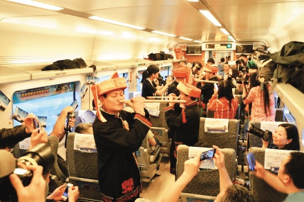 4点半起床赶上7点40分的三亚—三亚的全球第一条环岛高铁。全长653公里,设25个站,时速200公里。在这次旅游名博乘坐的“旅行十年”号上,我见证了高铁婚礼,黎族阿伯的鼻子吹笛子、吹木叶等。下次你来海南也可以坐高铁游全岛咯!
