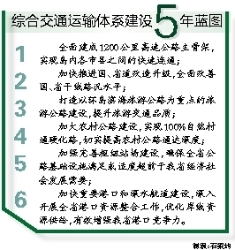 省交通运输厅厅长董宪曾表示,要加快构建海陆空立体交通体系,做好各种运输方式的无缝衔接。大力推进公交优先发展战略和城乡客运一体化发展,实现全省交通“一卡通”,行政村通班车率达到100%,推进交通运输基本公共服务均等化。大力发展现代物流业,加快推进物流通道和重点产业项目建设,整合物流资源,着力完善和构建现代物流服务体系。