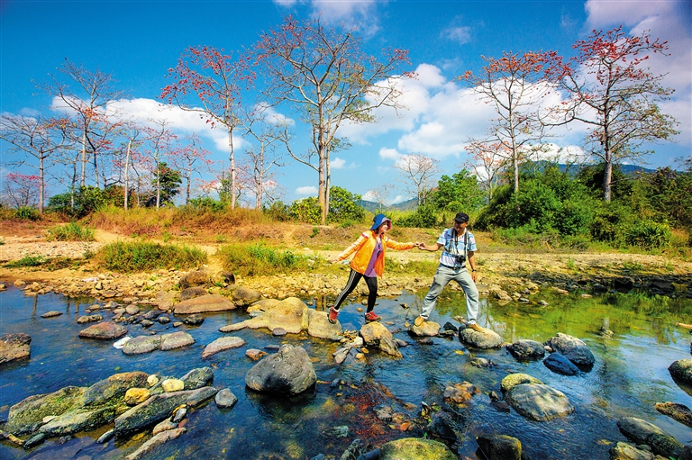 春晓之时,便是一年一度的“昌化江畔木棉红旅游活动”举办之期。当你驱车行驶在昌江七叉镇的乡村道路上,远山如黛,近处的田间地头、路边江畔不时出现一棵棵粗壮的木棉树,树干挺拔。不待月末,木棉花将热烈绽放,漫山遍野火红娇艳,四方游人齐聚于此,皆因被美丽的木棉花所深深吸引。